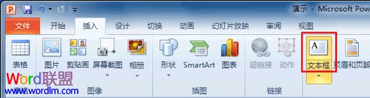 ②在PowePoint中单击“插入”选项卡中的“文本框”按钮,并在幻灯片中单击或拖动一个矩形区域来插入一个文本框。