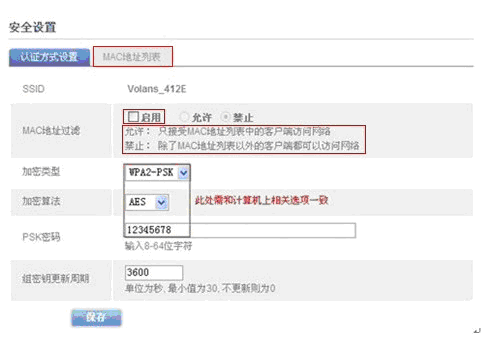 启用MAC地址过滤,选择允许或禁止,并根据界面相应注释,结合自己的需求,在MAC地址列表中添加相应MAC地址,添加之后不符合规则的MAC地址将不能上网。