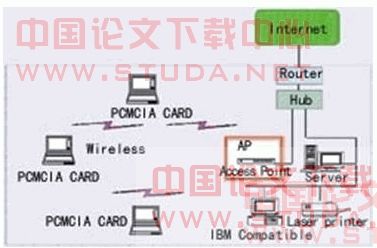 无线局域网络是便携式移动通信的产物,终端多为便携式微机。如图2所示,其构成包括无线网卡、无线接入点(AP)和无线路由器等。目前最流行的是IEEE802.11系列标准,它们主要用于解决办公室、校园、机场、车站及购物中心等处用户终端的无线接入。